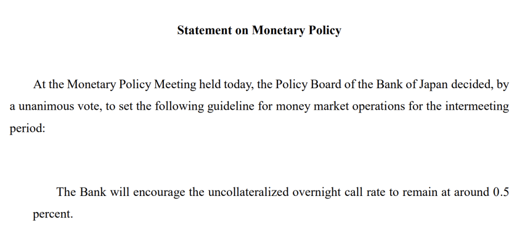 根据周四发布的央行政策声明,在为期两天的会议后,植田及其决策委员会将隔夜拆借利率维持在0.5%。